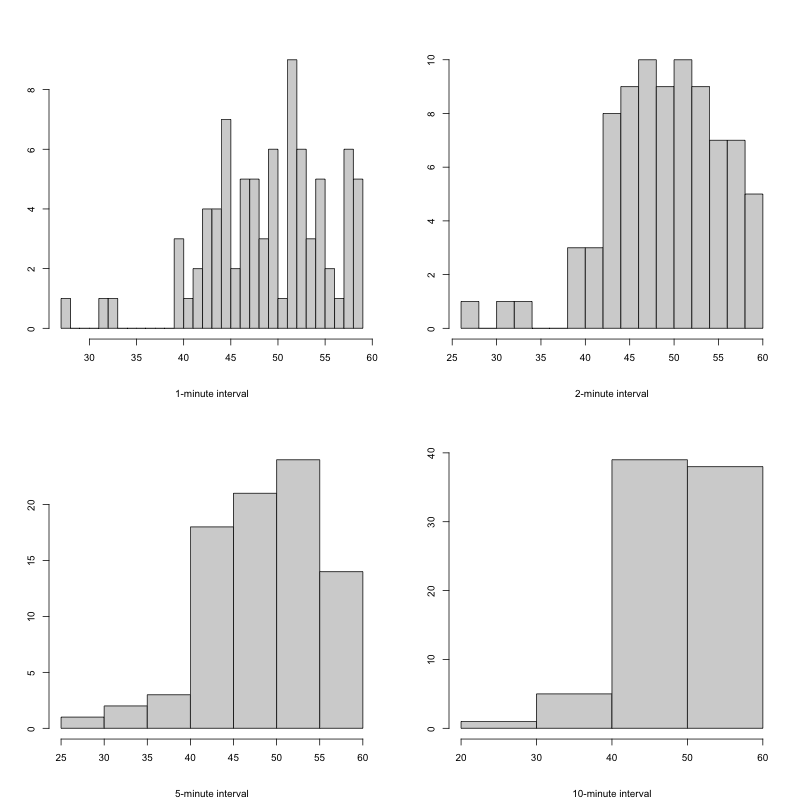 我们想要研究:上早八课程的学生一般什么时候会到教室。记学生到达教室的时刻为 \(X\) 。 \(X\) 表示 \(7\) 点后的分钟数,显然是一个随机变量。共采集了 \(83\) 名学生的打卡时间。我们分别按 \(1\) 分钟间隔、 \(2\) 分钟间隔、 \(5\) 分钟间隔和 \(10\) 分钟间隔绘制了直方图,如图 Fig. 5.1。学生大部分在 \(40\) 分到 \(55\) 分之间到达教室,一小部分学生会提前 \(20\) 分钟到达教室,还有一部分学生倾向于临近 \(8\) 点才到。